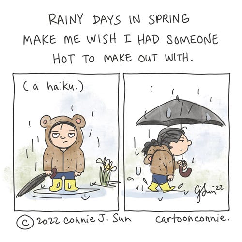 [Two-panel comic of a figure standing in rain with a comically resigned expression. She's wearing a bear hoodie with yellow galoshes and is holding a folded umbrella. She's standing in a puddle; there are some background daffodils. In panel 2, she starts walking off-frame, umbrella open over her head. Caption reads: "Rainy days in spring / Make me wish I had someone / Hot to make out with." In parentheses, "a haiku." Webcomic by Connie Sun, cartoonconnie, 2022.]