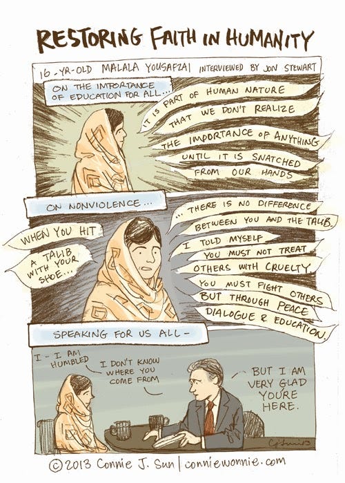 This is less of a comic and more just my hand taking notes as I listened to Malala Yousafzai's interview with Jon Stewart. Basically fan art. Better that you listen for yourself.
