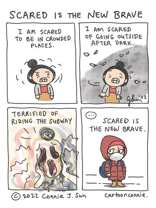 [4-panel comic of an Asian girl with a bun, coping with the rise of unprovoked violence and harassment against Asians in America in the pandemic. In panel 1, with a nervous expression, she says "I am scared to be in crowded places." In panel 2, eyes glare at her from the shadows: "I am scared of going outside after dark." Panel 3 is chaotically drawn disembodied "Scream" face with a bun. Text reads, "Terrified of riding the subway." In panel 4, she nervously scans the subway platform while she waits for a train, wearing a face mask and a hood over her head. Text reads, "Scared is the new brave." Autobio comic strip by Connie Sun, cartoonconnie, 2022.]