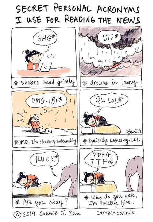 Secret Personal Acronyms I UseConnie SunFeb 28, 2019Share*shakes head grimly*drowns in irony*bleeding internally*quietly weeping lol*i'm totally fine