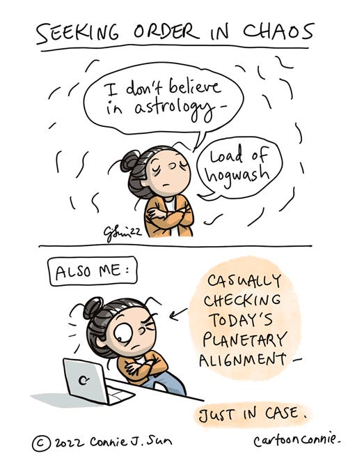 [2-panel webcomic about not believing in astrology but still seeking order in chaos. Panel 1: Cartoon girl with a bun and her arms crossed, says dismissively, "I don't believe in astrology - load of hogwash." Panel 2: An arrow points at girl, arms still crossed, sneaking a side-eyed look at a laptop screen, with the caption "Also me: Casually checking today's planetary alignment." Cartoon illustration by Connie Sun, cartoonconnie, 2022.]