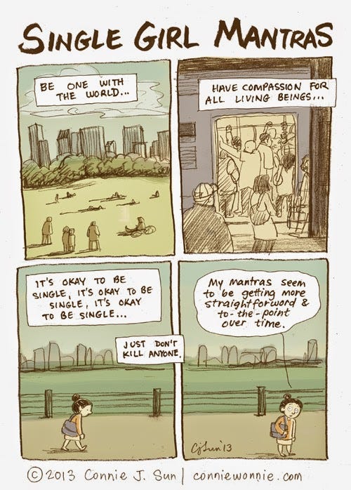 Single Girl MantrasConnie SunJul 10, 2013ShareSociety is unkind to single ladies, so it's important to have mantras ;)