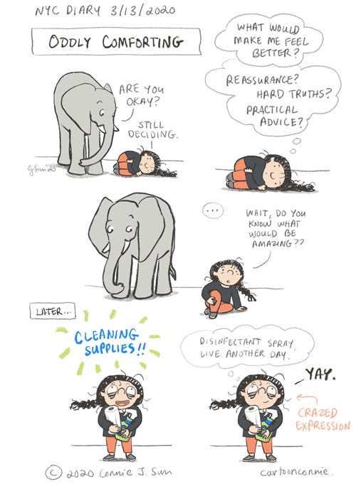 Posting this late, but this was me a few days ago. I had a little moment of feeling paralyzed and not knowing how to feel better. In addition to other hygiene recommendations to prevent the spread of COVID-19, I'm disinfecting surfaces at home more, which is oddly comforting. The downside is that I'm sure I look like a crazy person :)