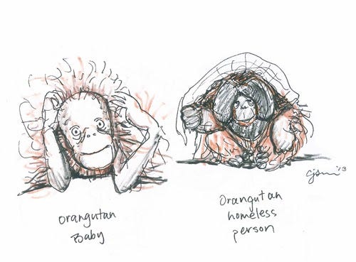 Sketchbook: Orangutan PeopleConnie SunOct 22, 2013ShareFire in the building this morning - did not finish today's cartoon. Here's a page from my sketchbook.