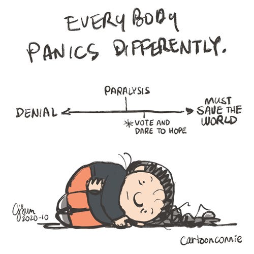 My style of panic is somewhere in between paralysis and the impulse to save the world. Voting is better than paralysis, hope is better than despair, and whatever you can do to keep yourself healthy and sane during this crazy pandemic-election year is worth it.