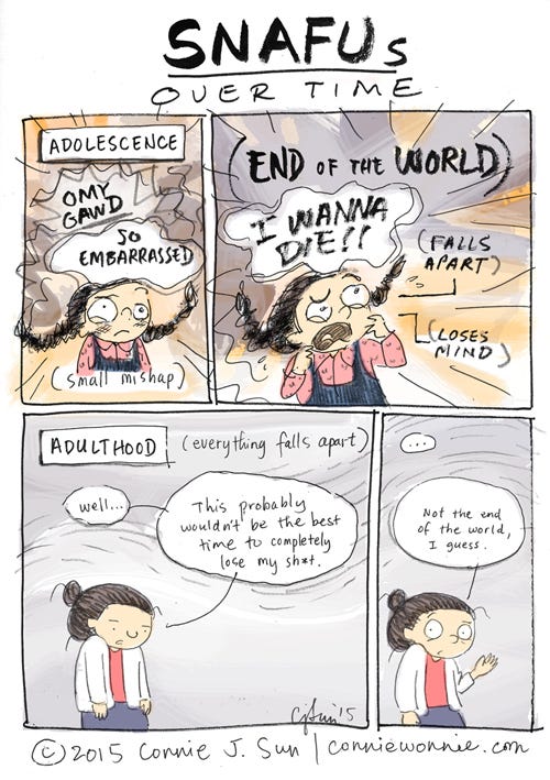 Snafus Over TimeConnie SunSep 25, 2015ShareIf I'm having a hard time, I sometimes think, "Well, this would've destroyed me as a teenager." Progress?