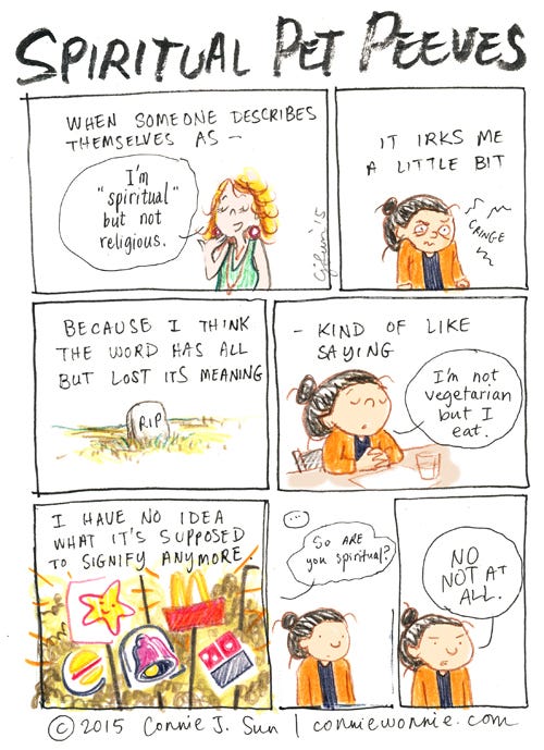 Spiritual Pet PeevesConnie SunAug 17, 2015ShareUpdate: I'm taking a short daily cartooning break for a work trip. Back on Friday.- Stay tuned for a new old maid column on McSweeney's Wednesday!- I'll be updating on Tumblr & InstagramHave a great week & thanks for reading :)