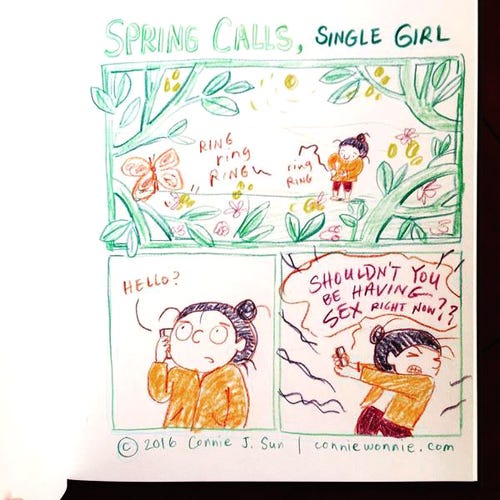 Spring Calls, Single GirlConnie SunApr 18, 2016ShareInternet down, but #spring calls in #nyc 🌿🌿Straight from my #sketchbook today.Â