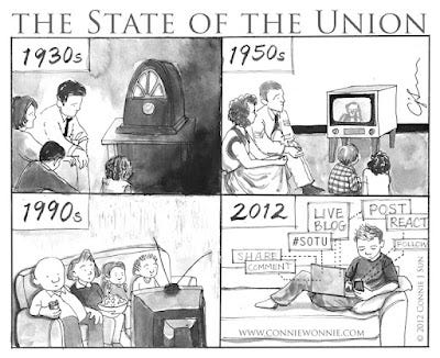 We've come a long way from huddling around a radio, listening to the State of the Union. This year, I streamed the address on HuffPo and, at one point, I had to step back for a moment and just observe what I was doing. Not only was I listening to the President speak and watching him on small 360-pixel video window, I was reading live commentary and being prompted to react and comment and share and post my thoughts in real-time throughout. I am amazed by how much my experience of receiving the address has changed just in a few years. How about you? What do you think?