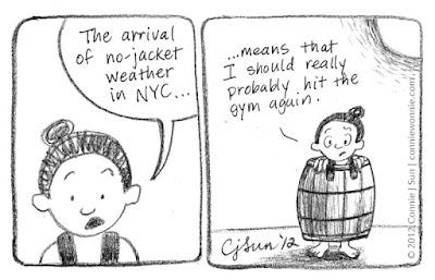 A Status Message a Day #75Connie SunMar 15, 2012ShareI'm working on a longer comic, so here's a quick sketch...Spring is making it's first appearance in NYC, which means I should probably get myself to the gym. Chagrin, chagrin.
