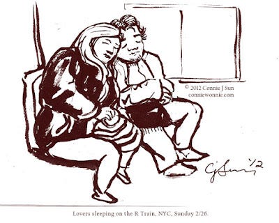 Subway Sketch of Lovers SleepingConnie SunFeb 27, 2012ShareFrom my sketchbook, a quick doodle of lovers sleeping on the R Train. It was a sweet moment when all was right with the world :)
