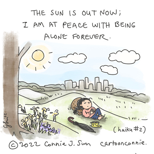 [Single-panel cartoon of a girl with a braid, napping barefoot on a grassy lawn, under blue skies on a sunny spring day. Yellow galoshes are off and umbrella is folded. Cartoon text is a haiku: "The sun is out now; / I am at peace with being / Alone forever." Haiku # 2 in a series. Comic illustration by Connie Sun, cartoonconnie, 2022.]