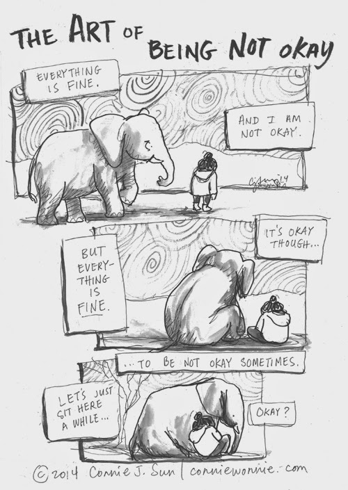 The Art of Being Not OkayConnie SunDec 30, 2014ShareDidn't think I had a cartoon in me today; improvised this one without a script.Not feeling so hot, but that's okay. Sometimes, you just gotta sit with an elephant.