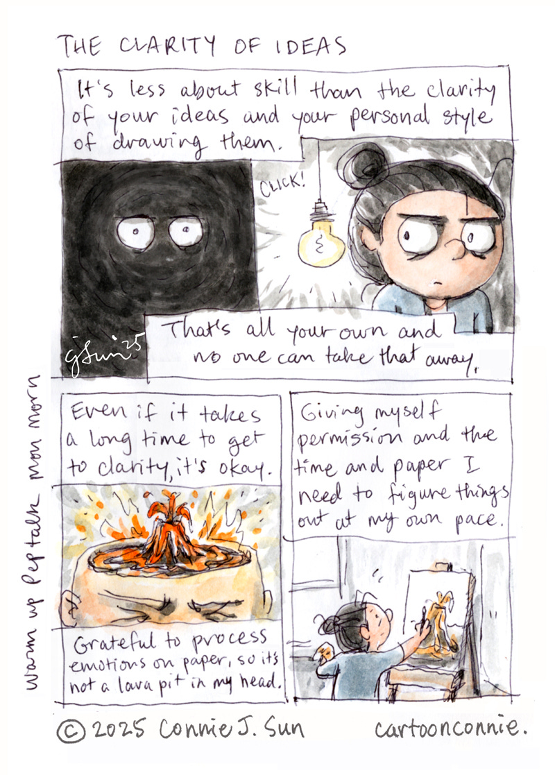 Description: 3-panel sketchbook comic about the clarity of ideas and developing a personal style to express them. In panel 1, cartoon eyes glow in pitch dark. With a click, a light bulb comes on and the whole face of a cartoon girl with a bun appears. Text reads, "It's less about skill than the clarity of your ideas and your personal style of drawing them. That's all your own and no one can take that away." In panel 2, there's a drawing of the inside of the character's head that is an erupting volcano, spewing molten lava, with an anguished expression on her face. Text reads, "Even if it takes a long time to get clarity, it's okay. Grateful to process emotions on paper, so it's not a lava pit in my head." In panel 3, the girl is calmly painting a volcano on an artist's easel in front of a window. Text reads, "Giving myself permission and the time and paper I need to figure things out at my own pace." Titled "The Clarity of Ideas," by Connie Sun, cartoonconnie, 2025. Watercolor and ballpoint pen on paper.