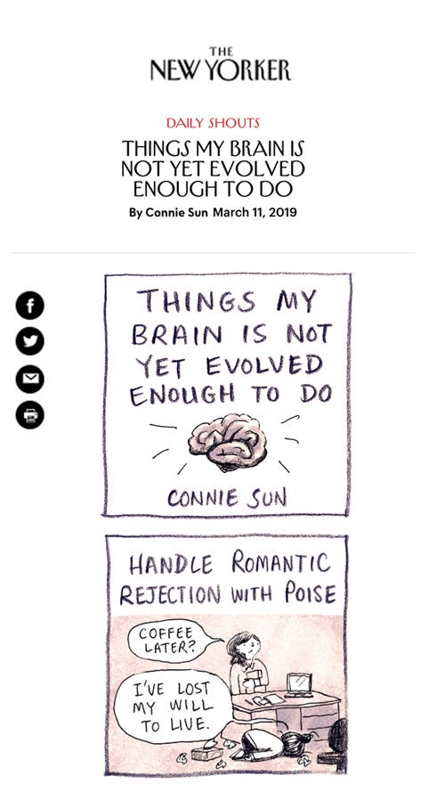 The New Yorker: Brain Evolution CartoonConnie SunMar 20, 2019ShareThings My Brain Is Not Yet Evolved Enough To Do, a new cartoon piece for The New Yorker's Daily Shouts. Full post here: https://newyorker.com/humor/daily-shouts/things-my-brain-is-not-yet-evolved-enough-to-do