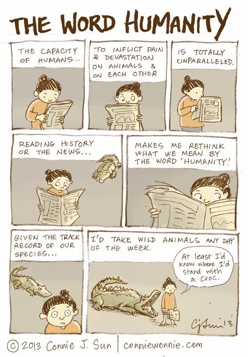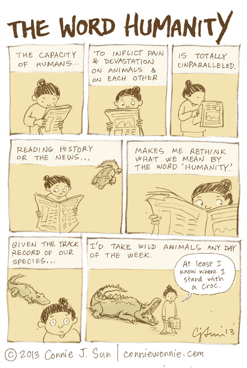The Word HumanityConnie SunMay 09, 2013ShareFeeling under the weather. This is the limit of my brain capacity today, as evidenced by the floating crocodile in empty space.Recolored version: