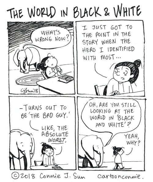The World in Black & WhiteConnie SunJun 20, 2018ShareWhen you realize you're the bad guy. The true test is what we do with that information.*Oops, a hand typo! Last panel should read: “Oh, are you still looking at the world in black and white?”** Update: typo corrected