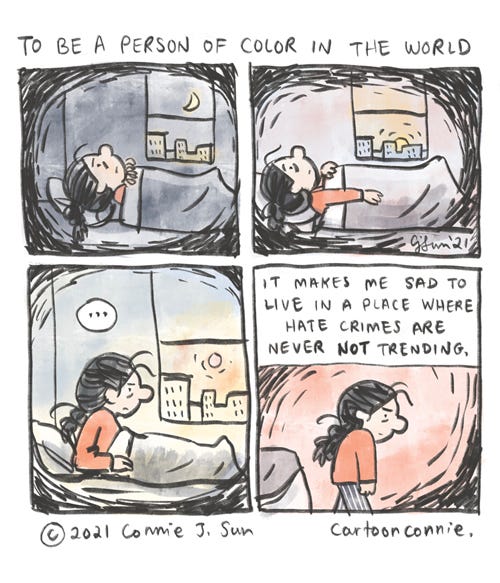 There was a shooting spree yesterday, targeting Asian women in Atlanta. I went to bed last night and woke this morning thinking about how unsafe it feels to be a person of color in the U.S. now -- and essentially, throughout history.