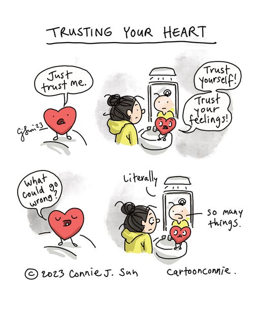 [4-panel borderless comic titled "Trusting Your Heart." In panel 1, a close-up of a plushy red heart with a tooth, saying "Just trust me." In panel 2, the heart is perched on a bathroom sink, addressing a cartoon girl with a bun in front of a mirror: "Trust yourself! Trust your feelings!" Panel 3 is another close-up of the heart, as it asks, "What could go wrong?" In panel 4, the heart looks up at the girl, while the girl looks at her reflection in the mirror. The reflection in the mirror responds independently: "Literally - so many things." Comic strip by Connie Sun, cartoonconnie, 2023.]
