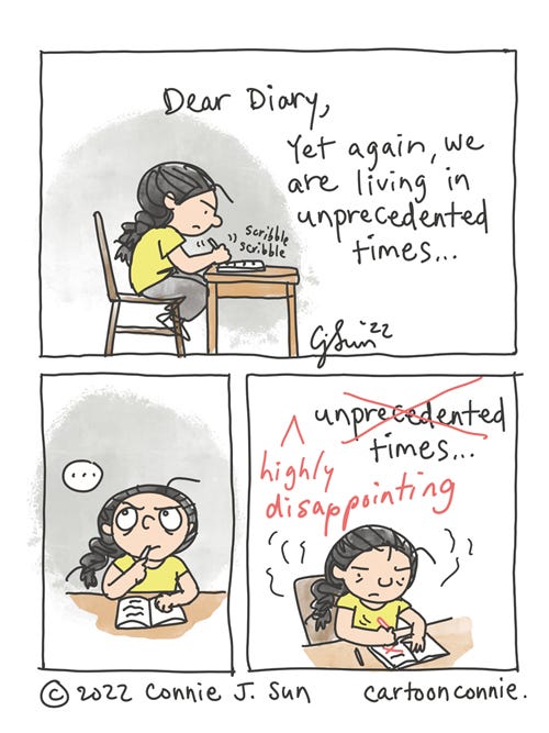 [3-panel comic of a cartoon girl with a braid, scribbling in her diary, reflecting on recent events. In panel 1, the girl sits at her desk, looking agitated and writes: "Dear Diary, Yet again, we are living in unprecedented times..." In panel 2, she pauses writing and thinks for a moment. A beat. In panel 3, she crosses out the word "unprecedented" with a red pen and inserts "highly disappointing" before the word "times." Comic strip by Connie Sun, cartoonconnie, 2022.]