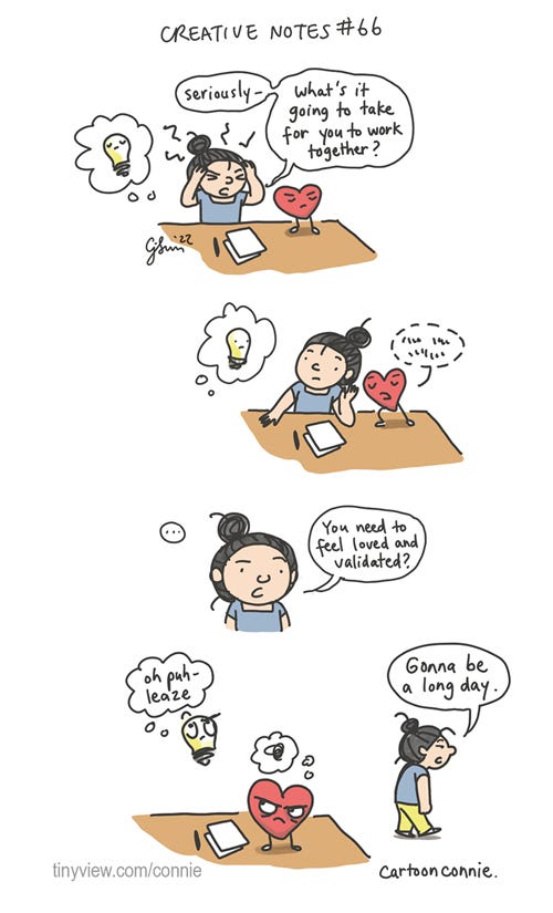 [4-panel comic of a girl with a bun at her desk, trying to get her heart and creativity to work together. Panel 1: the girl says in frustration to a heart and lightbulb, not speaking together, "Seriously, what's it going to take for you to work together?" Panel 2: the heart whispers something inaudible in her ear. Panel 3: the girl paraphrases the heart: "You need to feel loved and validated?" Panel 4: the light bulb rolls its eyes and thinks "Oh puh-leaze," while the heart angrily stews and the girl walks away wearily and says, "Gonna be a long day." From episode 66 of Creative Notes, an original webcomic series by Connie Sun, cartoonconnie, 2022, for Tinyview comics https://tinyview.com/connie]