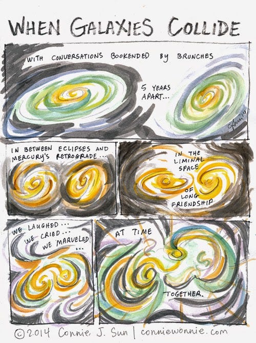 When Galaxies CollideConnie SunOct 13, 2014ShareFriendship: a poem :)Sometimes I can't believe how lucky I am to know the people I do.