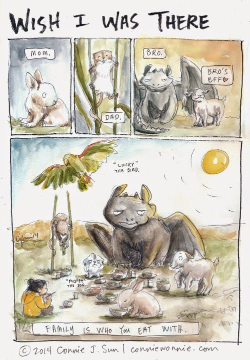Wish I Was ThereConnie SunDec 25, 2014ShareFamily = who you eat with. I drew this for my family, based on their zodiac spirit animals. Hope everyone gets to have their fill today. Happy merry.